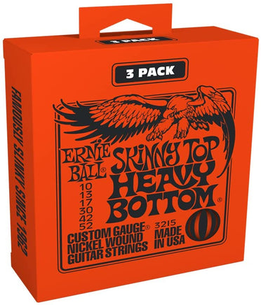 Now available in convenient three-set packs Ernie Ball Skinny Top Heavy Bottom Slinky Strings are the perfect hybrid set for those who like thick bottom strings without sacrificing the ability to solo on smaller strings These strings are precision manufactured to the highest standards and most exacting specifications to ensure consistency, optimum performance, and long life. The wound strings are made from nickel plated steel wire wrapped around a hex shaped steel core wire. The plain strings are made of specially tempered tin plated high carbon steel producing a well balanced tone for your guitar.